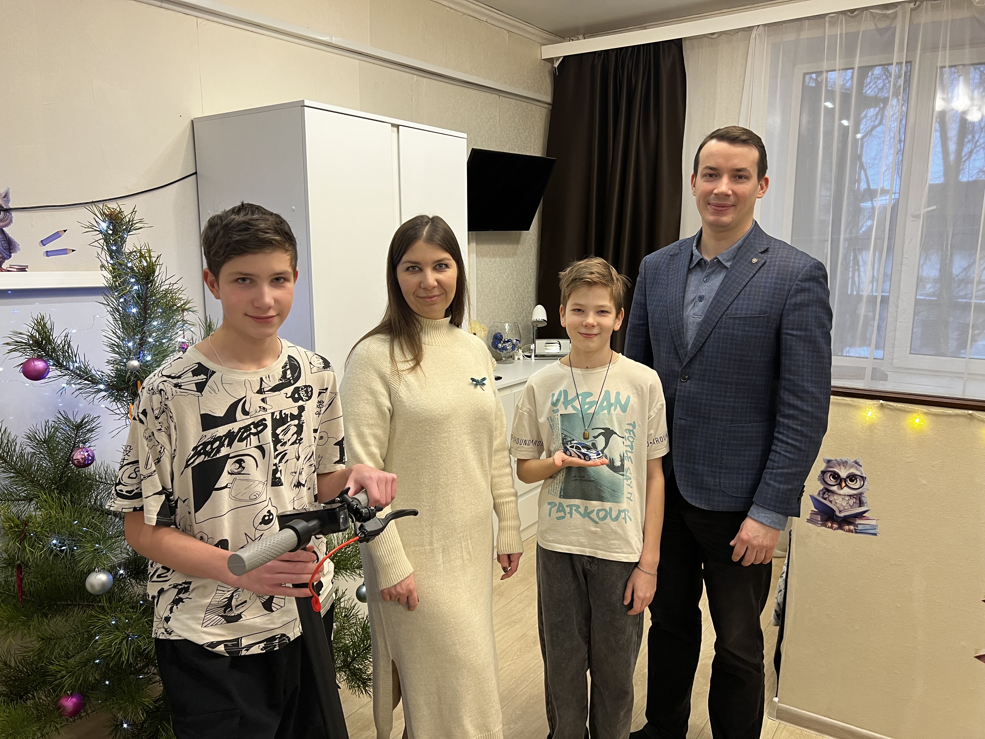 Радиоупраляемую машинку и электросамокат братьям передал от Леонида Слуцкого руководитель партии в регионе, депутат Костромской областной Думы Руслан Фёдоров. Он поздравил ребят, а также их маму Ирину, пожелал всегда верить в себя и не бояться мечтать.