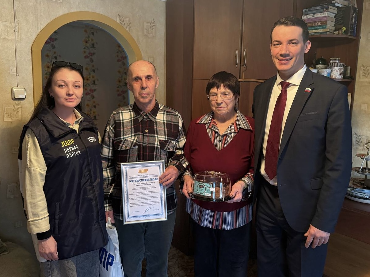 Гости вручили юбилярам благодарственное письмо от Председателя ЛДПР Леонида Слуцкого. Помимо тёплых слов поздравлений, супругам передали приятные и вкусные подарки.