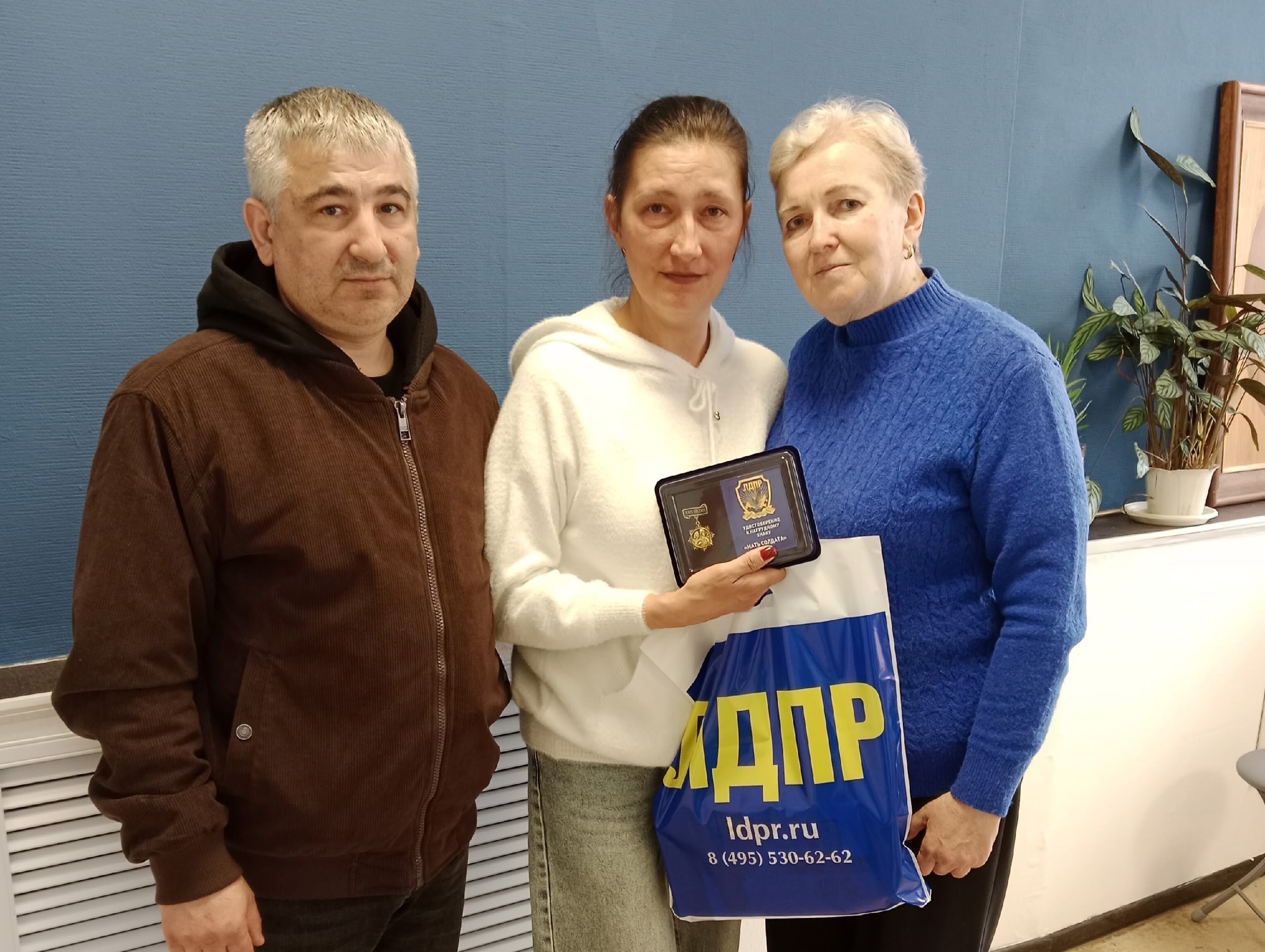 Координатор партии в Давыдовском округе Костромы Светлана Писарева передала нагрудный знак ЛДПР «Мать солдата» Оксане Григорьевой. Её старший сын Артём Асвадуров погиб, защищая Родину в ходе СВО.