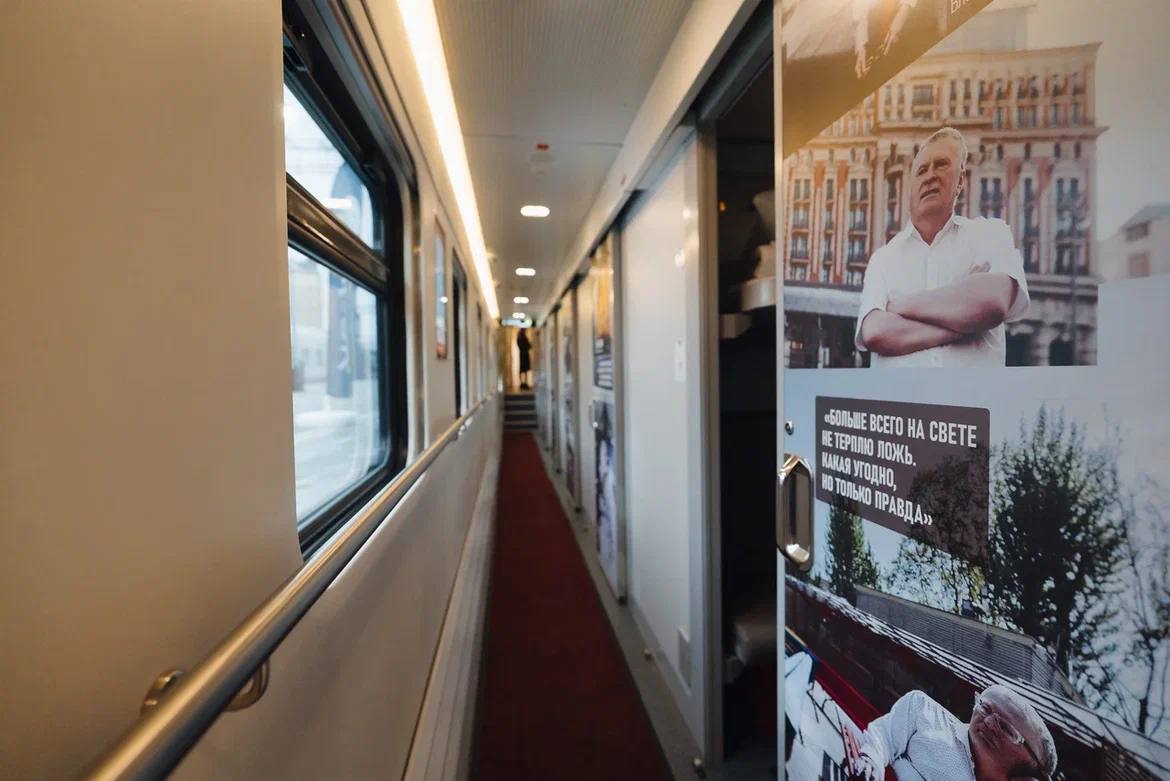 Каждый штабной вагон украшен символикой ЛДПР и Фонда памяти Жириновского. Внутри пассажиров ждет мини-библиотека с его трудами, исторические фото и цитаты.