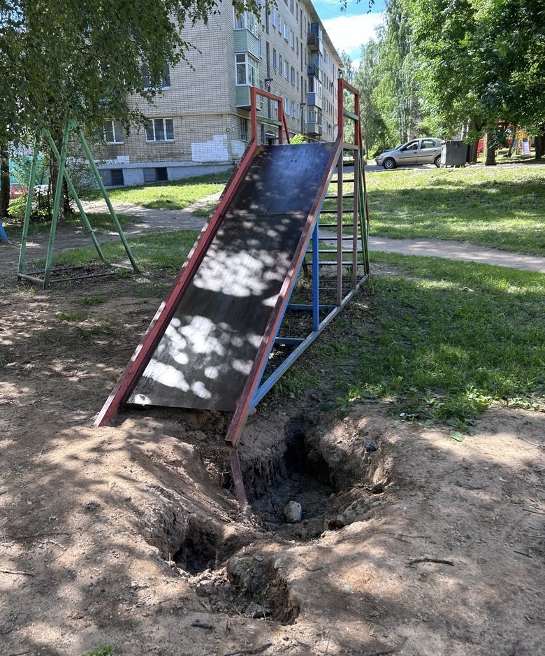 Почему жители боятся за жизнь детей, становится понятно уже при виде качелей: в стороны качаются не сиденья, которых, к слову, совсем нет, а ржавые и покосившиеся железные опоры. Опасна и горка, с которой ребенок может съехать в глубокую яму - здесь обвалилась земля.